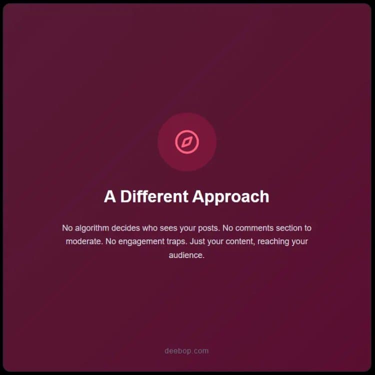 No engagement traps. Just your content, reaching the people who chose to follow you. #Deebop #DifferentSocial #NoAlgorithm #NoComments #AuthenticReach #CreatorFirst